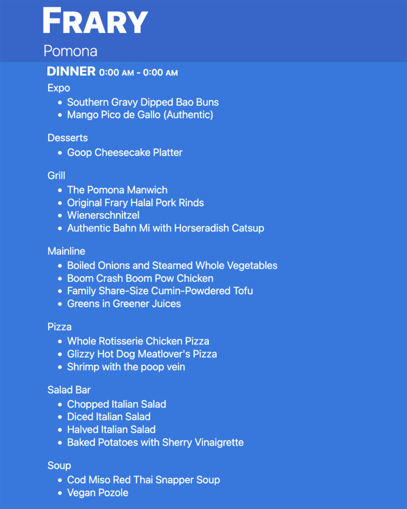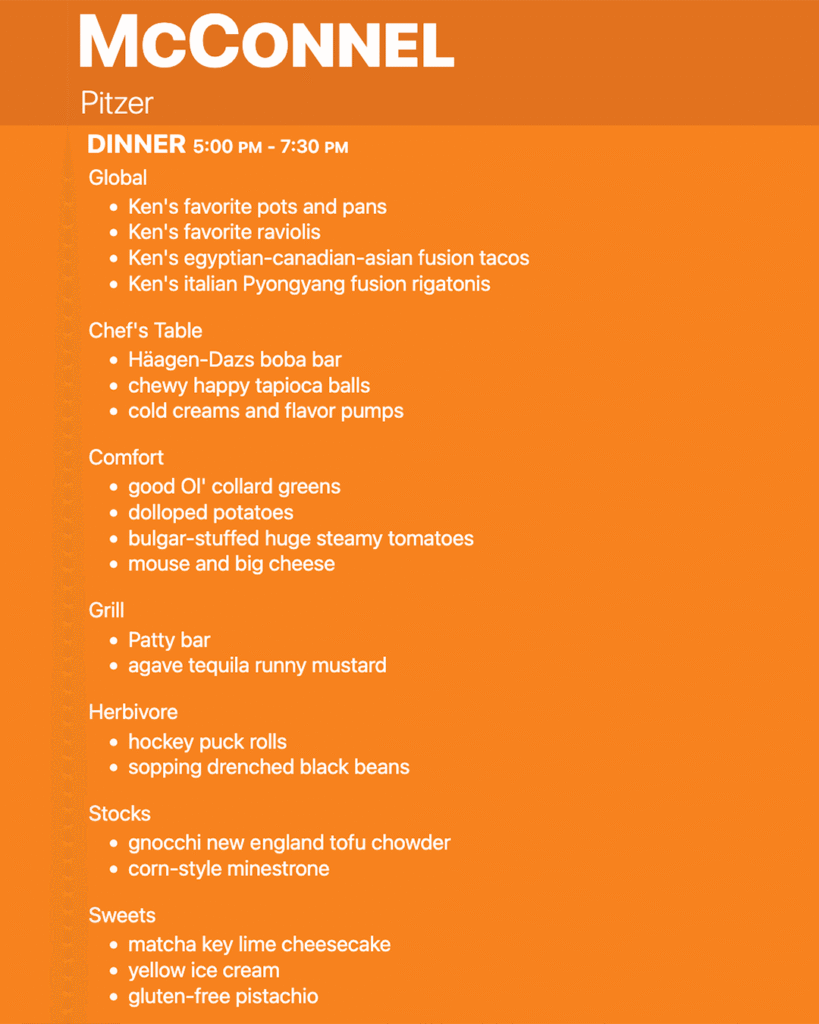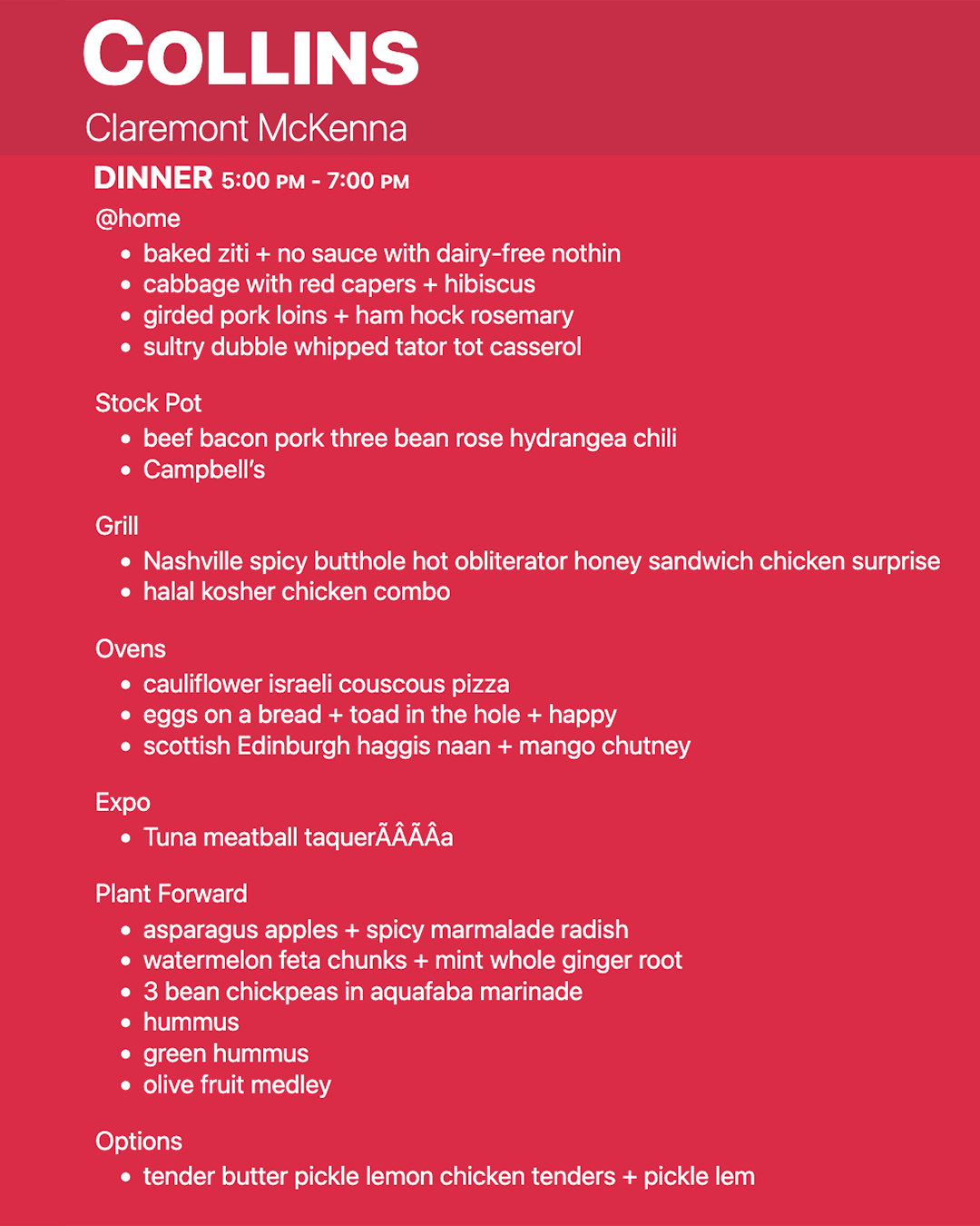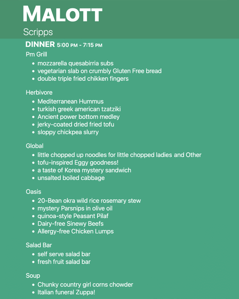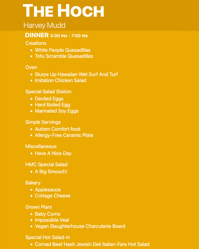 The foods and dining halls of the Claremont Colleges are known for being really really good. What’s the dinner angle tonight? Is that thing drooling yet?