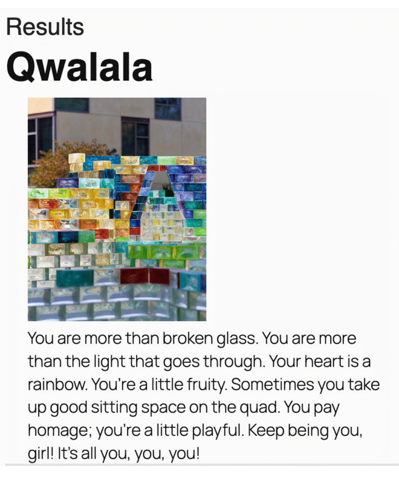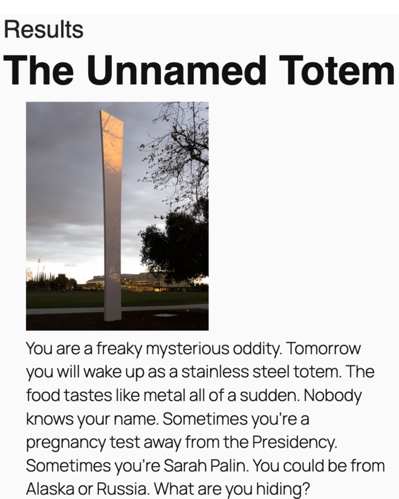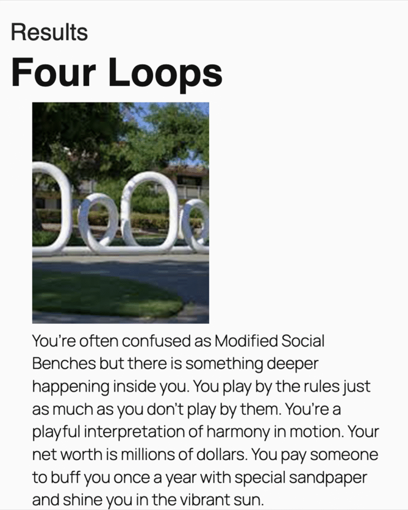 Are you a Qwalala or an unnamed 40 foot tall totem? Or are you Modified Social Benches??? Find out your true calling as a multi-million dollar “public art” installation at Claremont McKenna College, the #7 ranked National Liberal Arts school in America! Tag your friends that are The Cube, Four Loops, or The Enigma of Pleasure!
