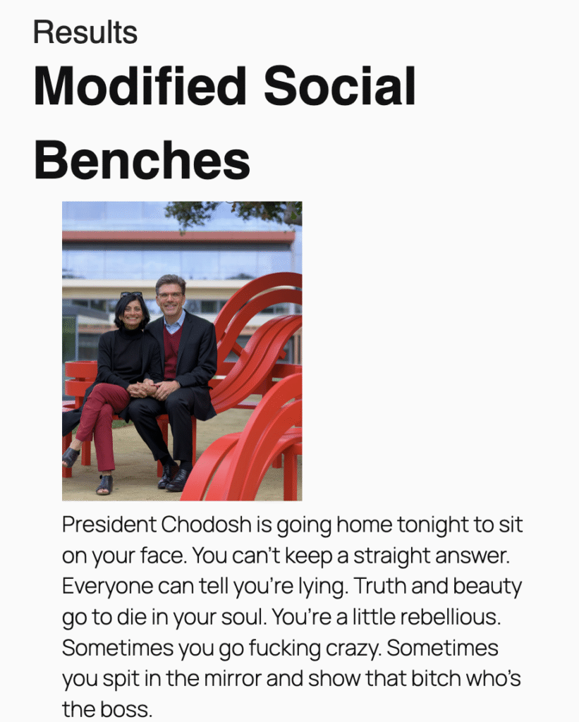 President Chodosh is going home tonight to sit on your face. You can’t keep a straight answer. Everyone can tell you’re lying. Truth and beauty go to die in your soul. You’re a little rebellious. Sometimes you go fucking crazy. Sometimes you spit in the mirror and show that bitch who’s the boss.