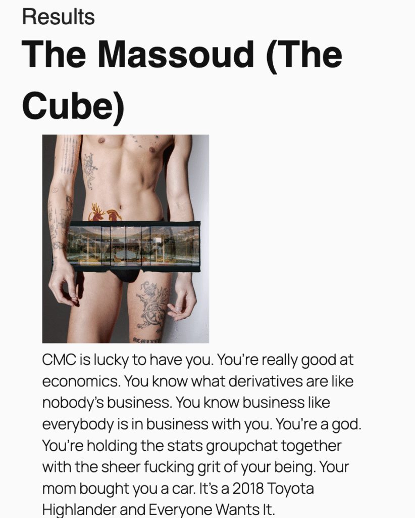 CMC is lucky to have you. You’re really good at economics. You know what derivatives are like nobody’s business. You know business like everybody is in business with you. You’re a god. You’re holding the stats groupchat together with the sheer fucking grit of your being. Your mom bought you a car. It’s a 2018 Toyota Highlander and Everyone Wants It.