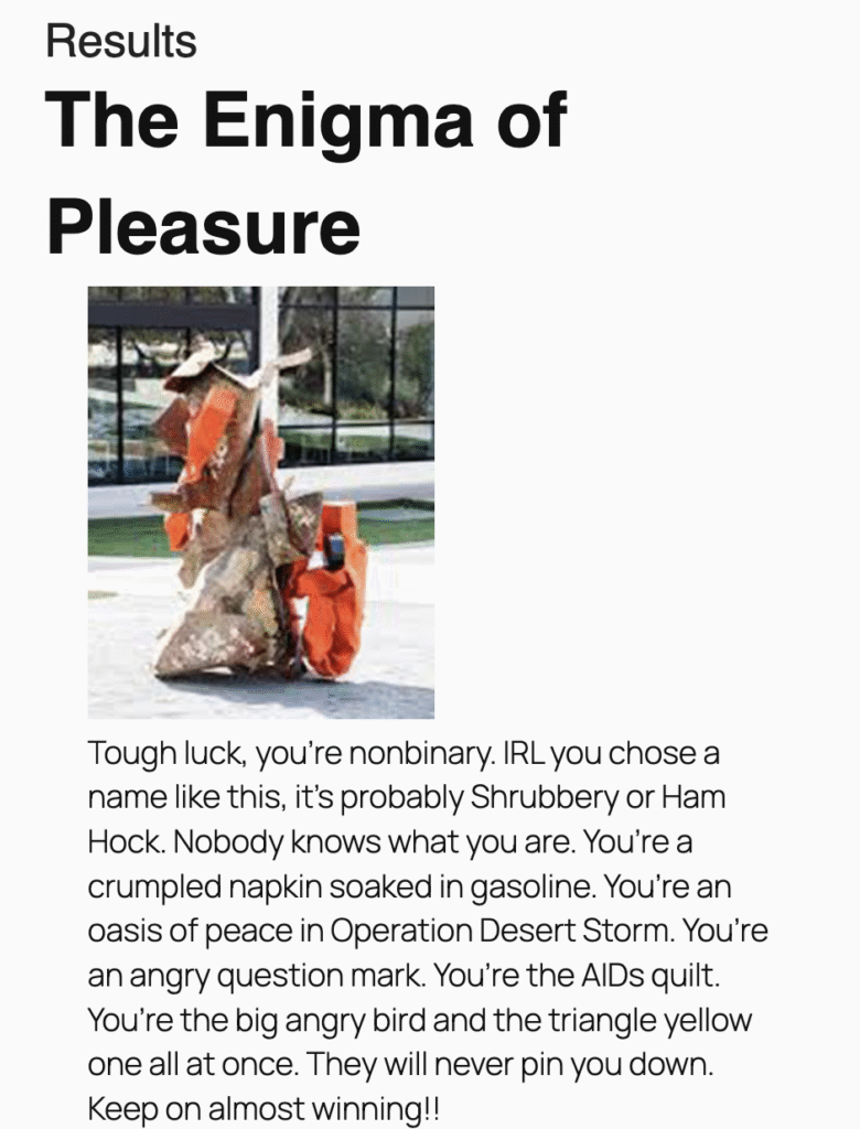 Tough luck, you’re nonbinary. IRL you chose a name like this, it’s probably Shrubbery or Ham Hock. Nobody knows what you are. You’re a crumpled napkin soaked in gasoline. You’re an oasis of peace in Operation Desert Storm. You’re an angry question mark. You’re the AIDs quilt. You’re the big angry bird and the triangle yellow one all at once. They will never pin you down. Keep on almost winning!!