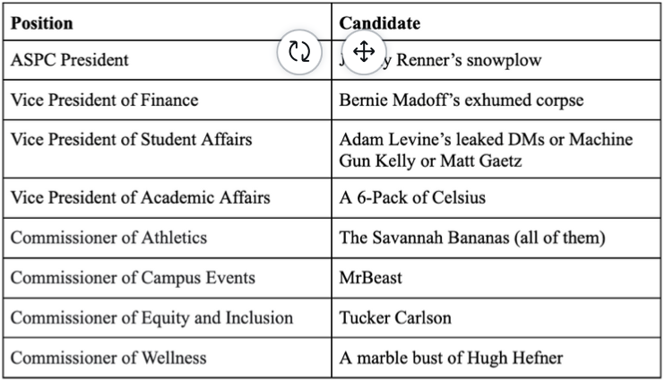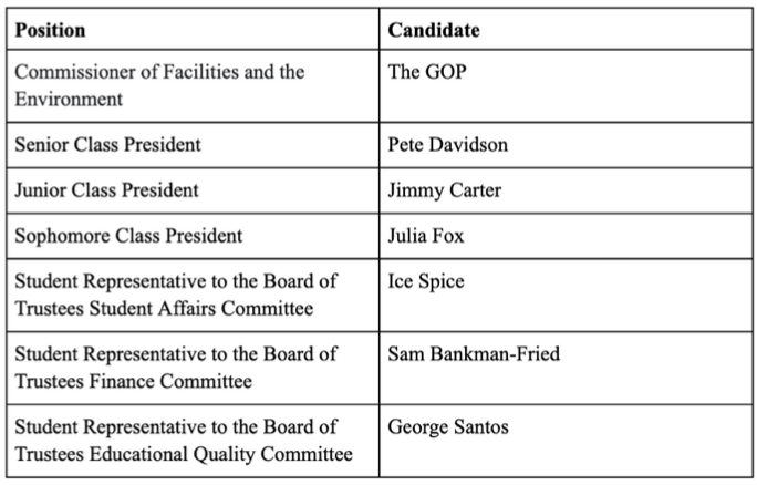 But fear not, uneducated voter. The Golden Antlers is here with our nominations for each student body position (write-in votes encouraged).