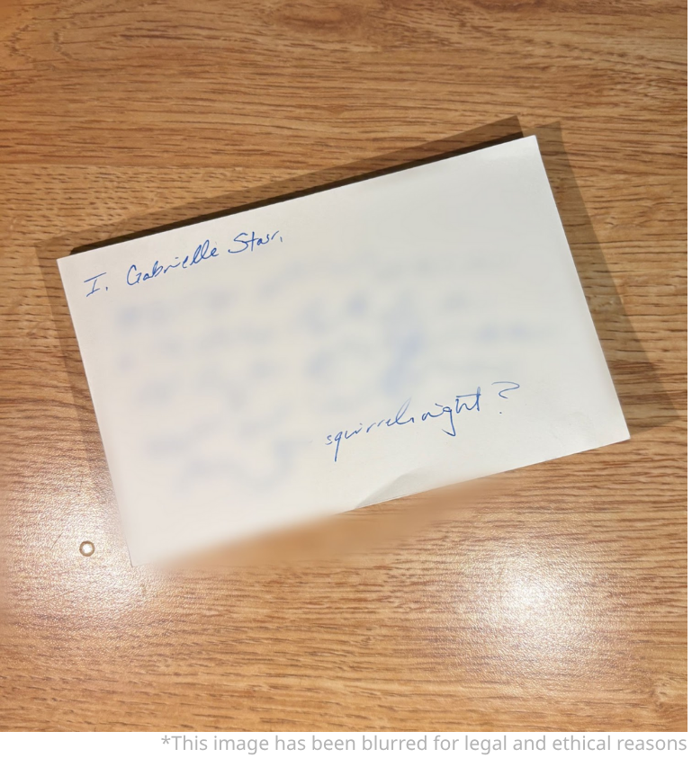 Text Displayed: “I, Gabrielle Starr (REDACTED) squirrel, right?”