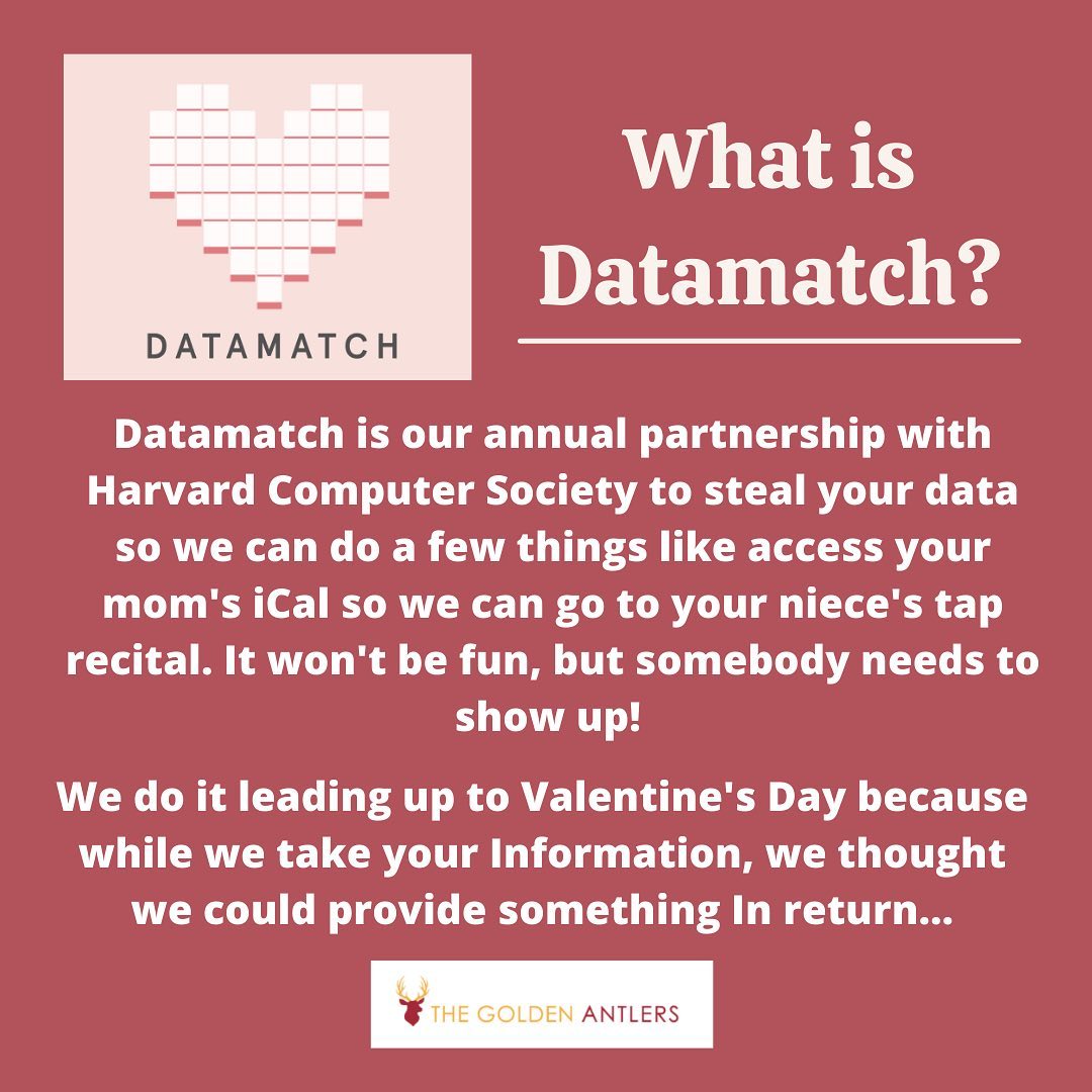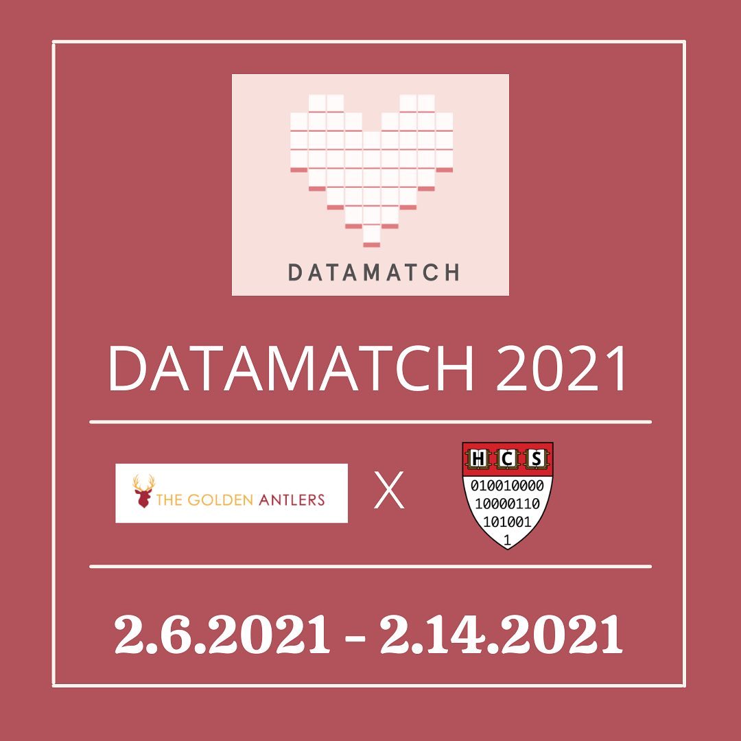 Introducing… DATAMATCH 2021! For the third year in a row, we’re partnering with Harvard Computer Society to give you love, list, and wonder on Valentine’s Day. More info to come, but find out the basics here.